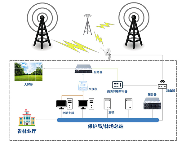 指揮中心:煙火識別預警系統,AI識別煙火服務器,GIS輔助決策系統、中心儲存服務器,大屏幕等